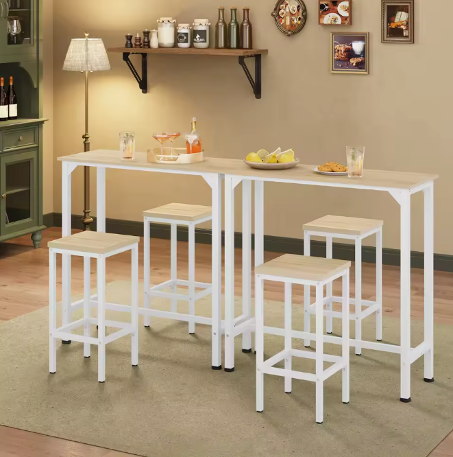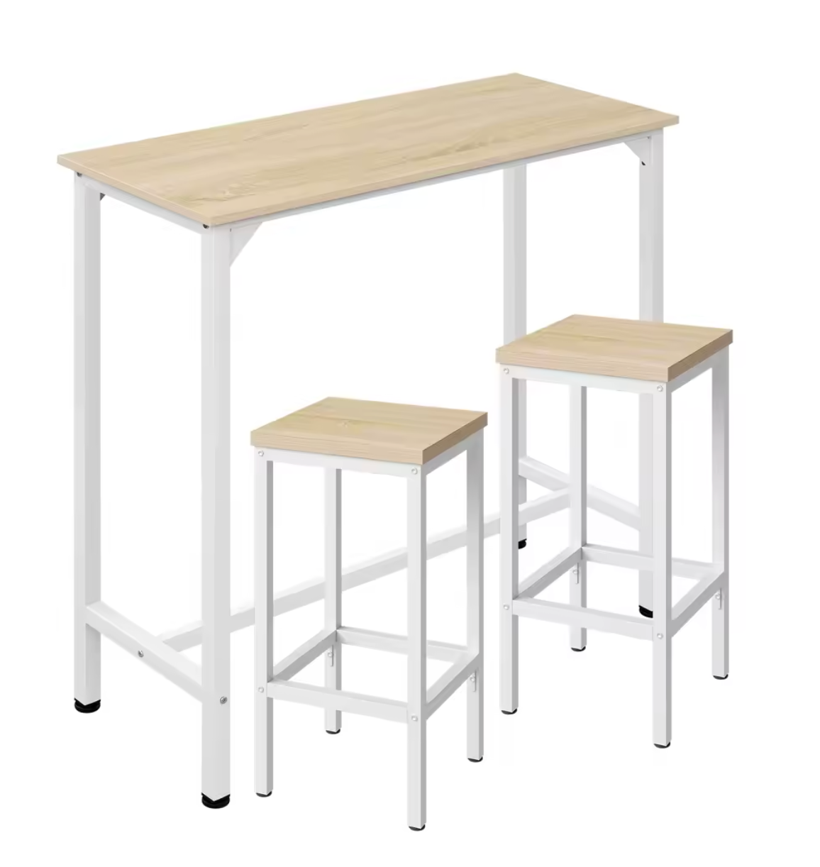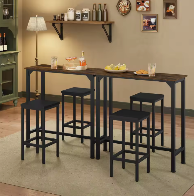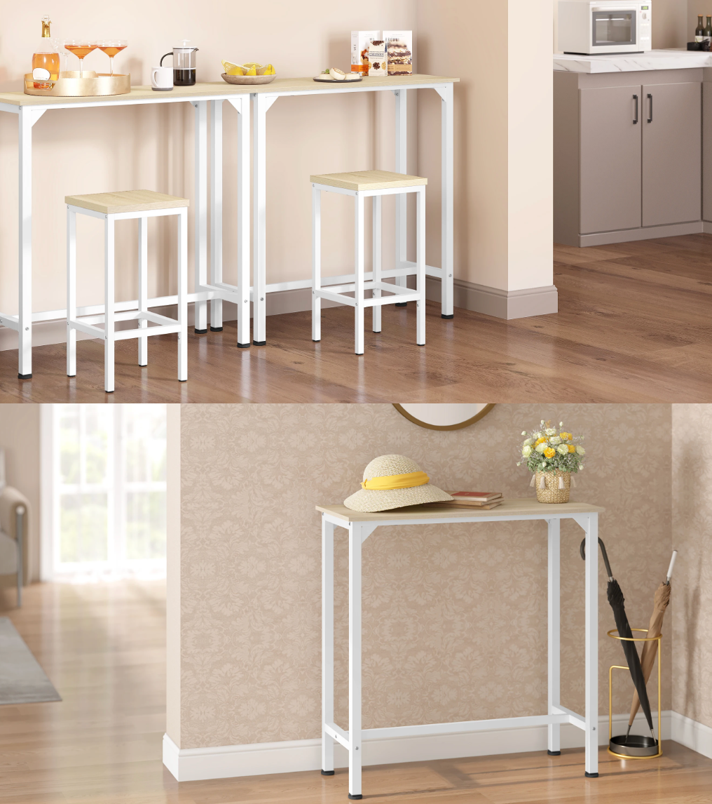 Deze stijlvolle 3-delige bartafelset is de ideale oplossing voor compacte ruimtes zoals een woonkamer, keuken of balkon. Het moderne industriële ontwerp combineert een stevig metalen frame met een houtkleurig tafelblad voor een functioneel en sfeervol geheel. Dankzij de twee bijpassende barkrukken creëer je in een handomdraai een gezellige plek om te ontbijten, borrelen of werken.