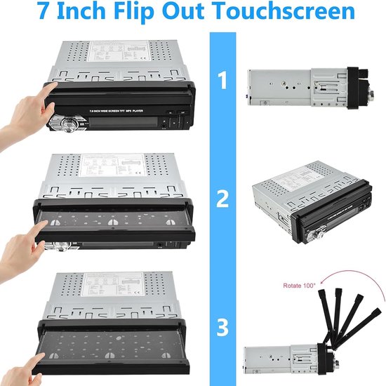 - Formaat 1 DIN met uitschuifbaar 7 inch HD-touchscreen (172 x 137 x 50 mm) – ideaal voor compacte dashboardinstallaties.
