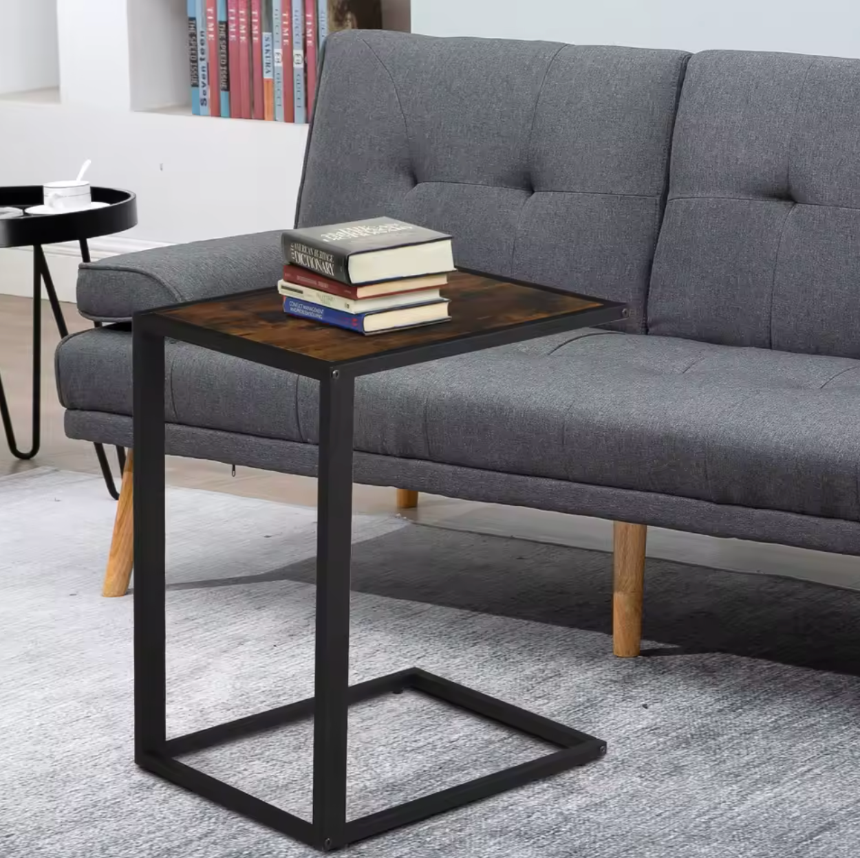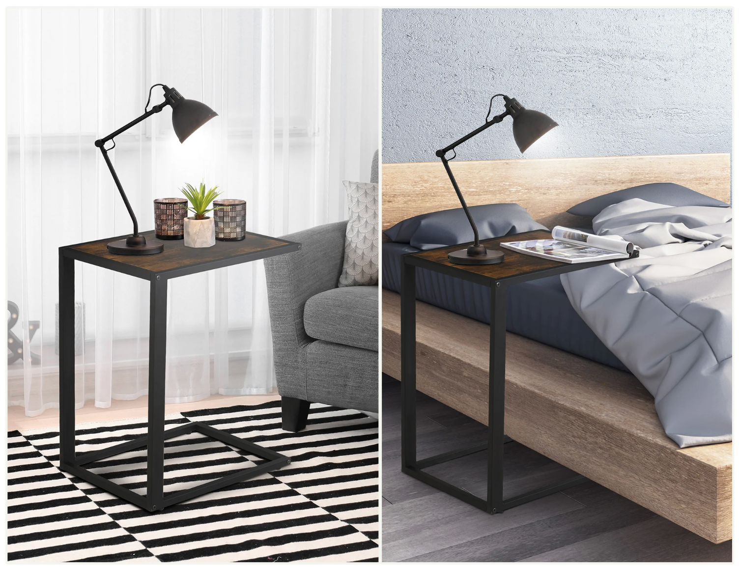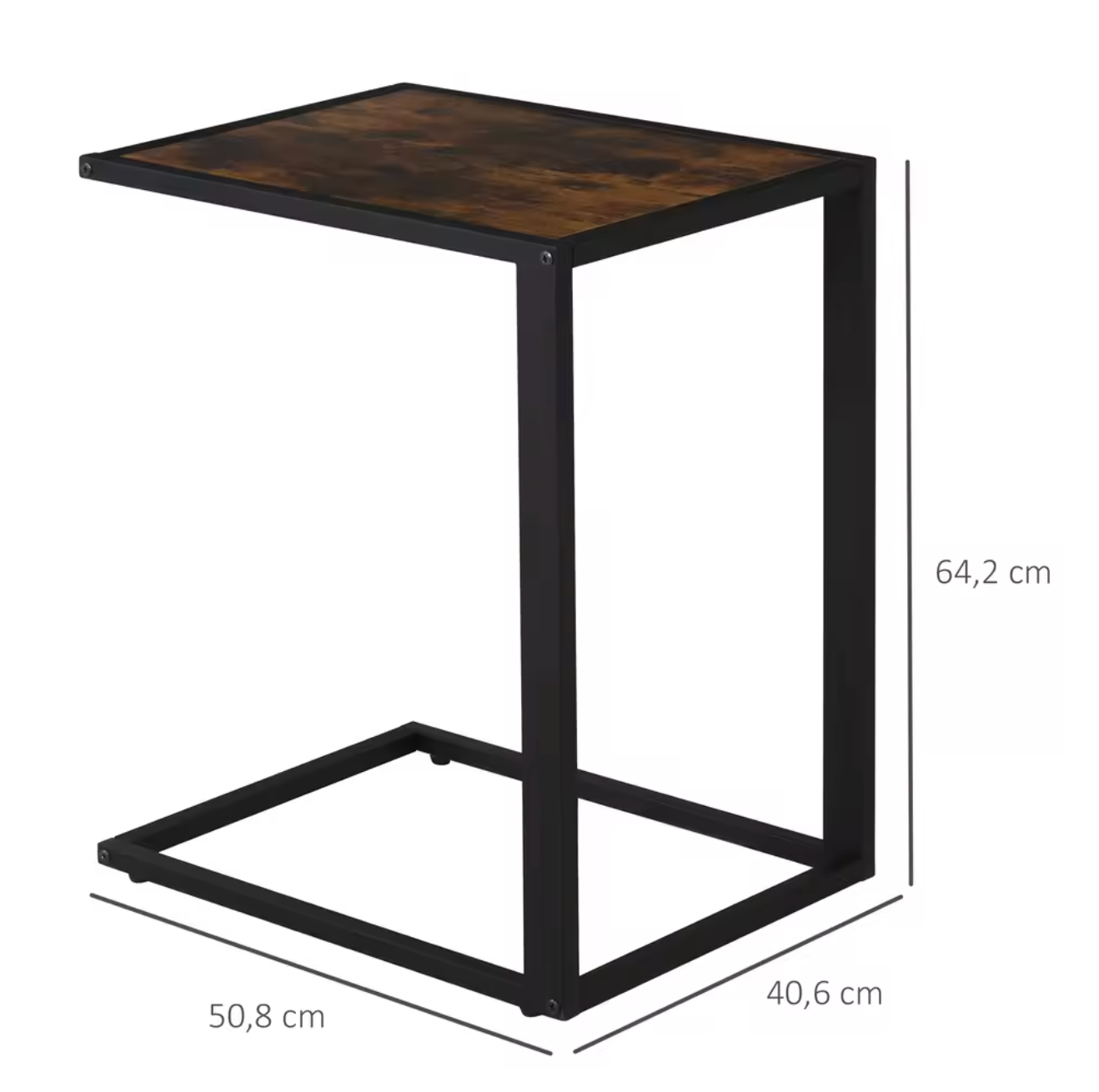 Deze industriële C-vormige bijzettafel is een stijlvolle en praktische toevoeging aan elk interieur. Dankzij het minimalistische ontwerp en de robuuste constructie is deze tafel ideaal als salontafel, banktafel of laptoptafel in de woonkamer, slaapkamer of thuiskantoor. Het stalen frame en het MDF-tafelblad combineren stevigheid met een warme rustieke uitstraling, perfect passend bij moderne en industriële woonstijlen.
