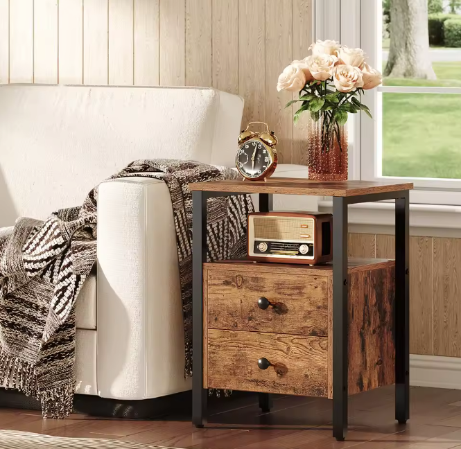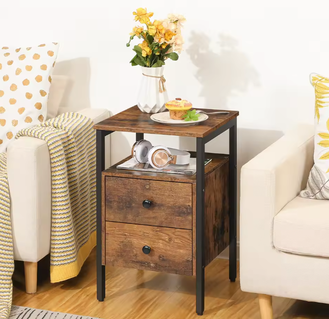 Breng industriële flair en praktische opbergruimte in je interieur met dit vierkante nachtkastje met 2 lades en open planken. De combinatie van rustiek bruin houtdecor, een matzwart metalen frame en ronde knoppen geeft dit meubel een robuuste maar stijlvolle uitstraling. Ideaal naast je bed, bank of als accenttafel in elke ruimte.
