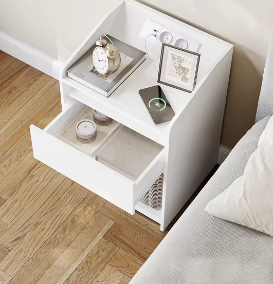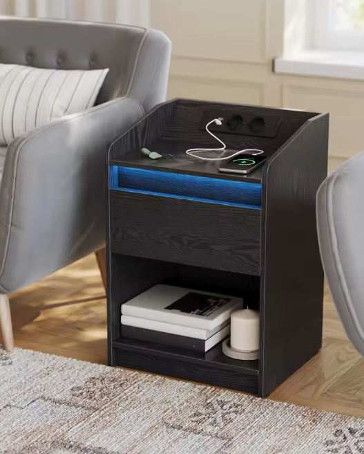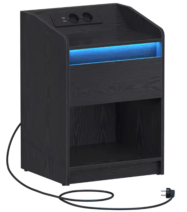Geef je slaapkamer een moderne upgrade met dit multifunctionele nachtkastje met LED-verlichting en geïntegreerd laadstation. Het schuine oplaadpaneel maakt het aansluiten van je apparaten eenvoudig, terwijl de verstelbare LED-verlichting voor elke sfeer geschikt is. Met een ruime lade en extra vak biedt het nachtkastje praktische opbergruimte én een stijlvolle uitstraling.