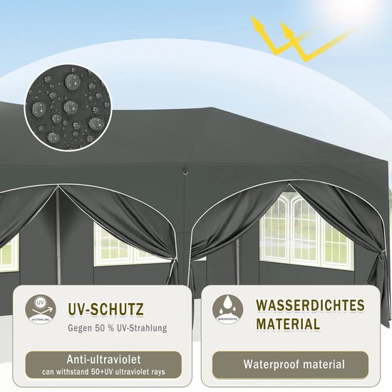 Deze partytent is ontworpen met het oog op duurzaamheid en gemak. De solide metalen structuur met poedercoating biedt een stevige basis die bestand is tegen roest, terwijl de meegeleverde 12 grondpalen en 6 lange touwen zorgen voor extra stabiliteit. Het waterdichte dak, gemaakt van 210D Oxford-stof met een zilveren coating, biedt bescherming tegen regen en blokkeert 98% van schadelijke UV-stralen, met een UV-beschermingsfactor van 50+.