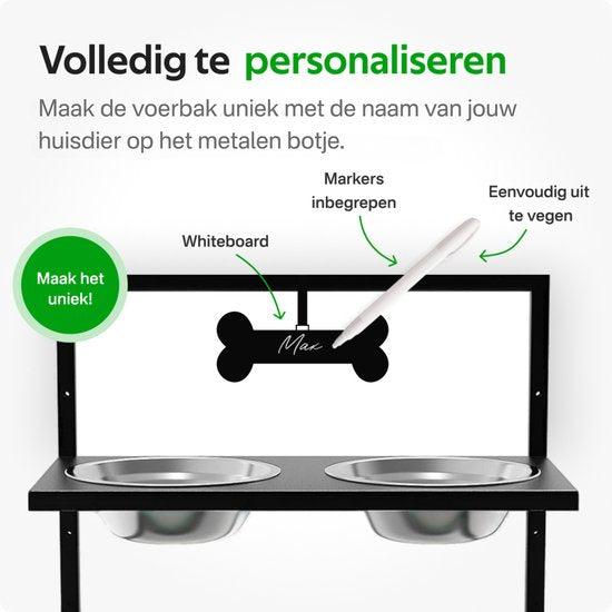 Met de leuke toevoeging van het naambordje kunt u de voerbak helemaal veranderen naar uw keus. Het naambordje is gemaakt van staal, waardoor het makkelijk is om het schoon te maken en de tekst te veranderen. De set komt inclusief de witte marker voor het naambordje.