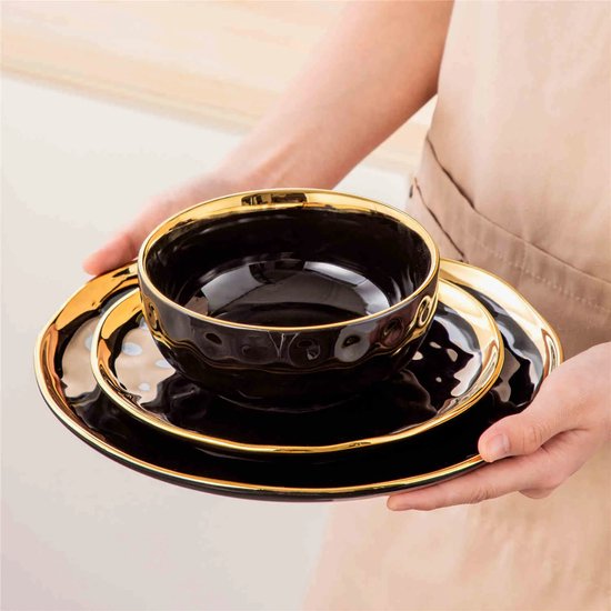 Deze 12-delige set in een chique zwart met gouden rand is perfect voor iedereen die houdt van een stijlvolle en luxe uitstraling aan tafel. Of je nu een feestelijk diner organiseert of gewoon je dagelijkse maaltijden wilt opvrolijken, deze set biedt de ideale combinatie van functionaliteit en esthetiek.