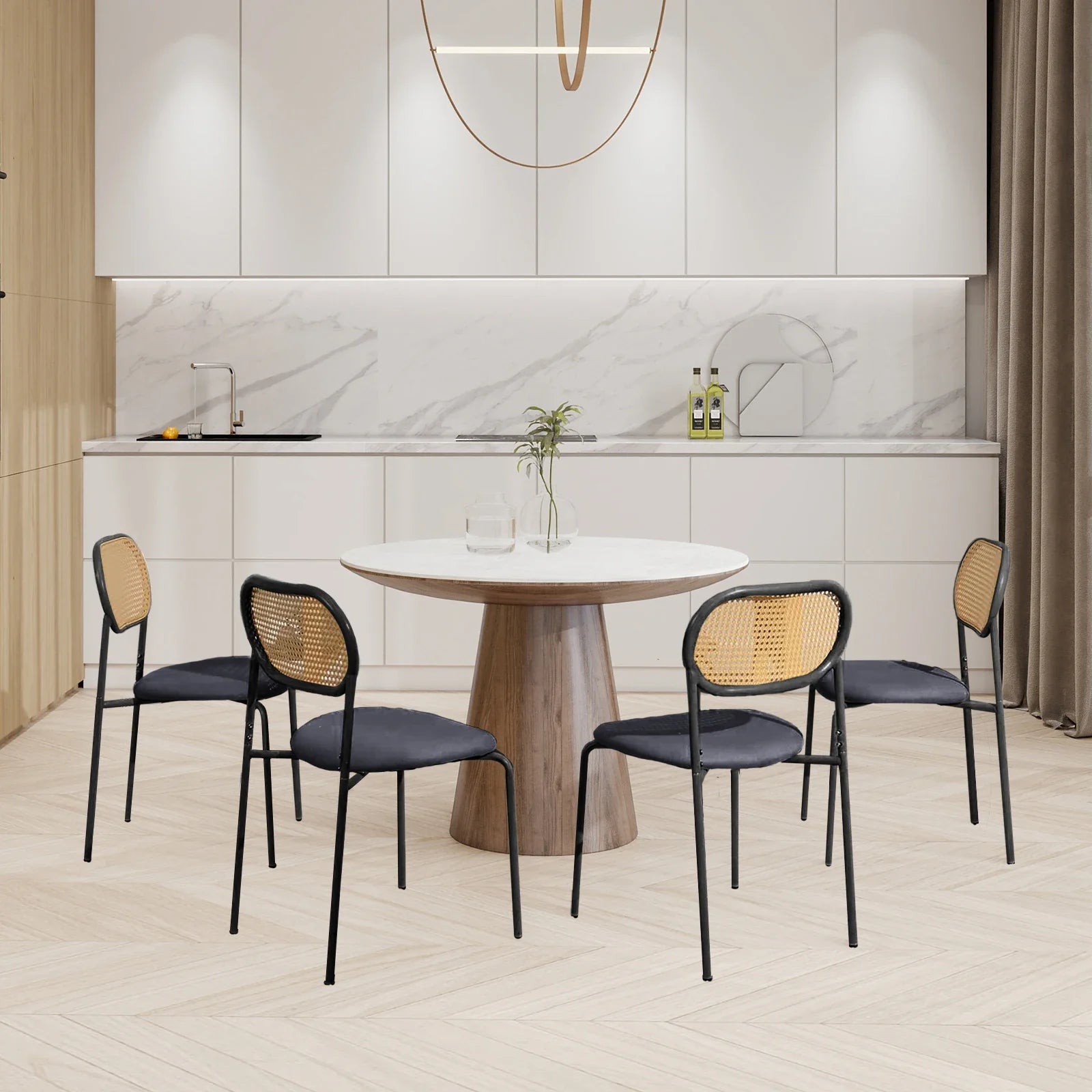 Breng natuurlijke elegantie en comfort samen met deze set van 2 rotan eetkamerstoelen. Dankzij de handgeweven rotan rugleuning, zachte stoffering en verstelbare metalen poten, zijn deze stoelen niet alleen een blikvanger in uw interieur, maar ook ontworpen voor dagelijks comfort. Perfect als eetkamerstoel, kaptafelstoel of accentstoel in de woonkamer – een stijlvolle alleskunner voor elk modern huis.