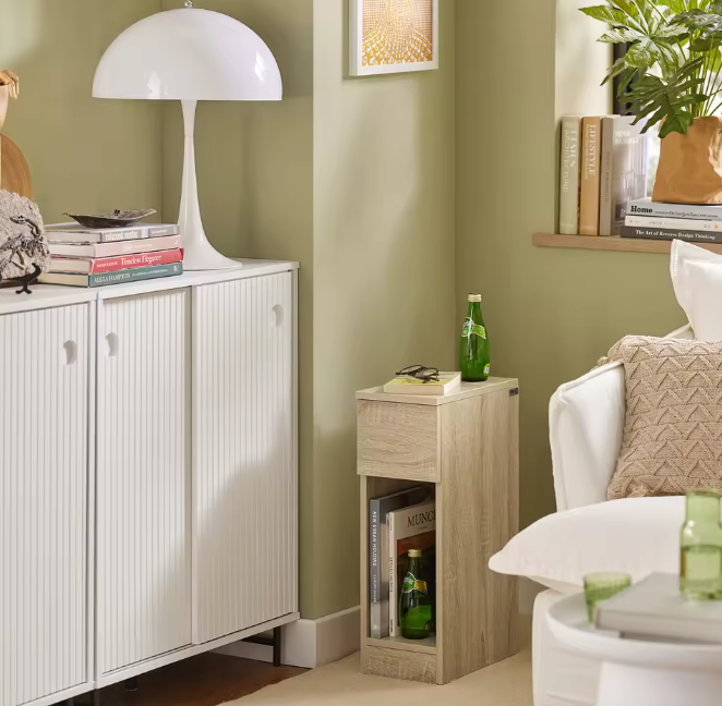 Voeg praktische opbergruimte toe aan uw slaapkamer of woonkamer met dit smalle nachtkastje van 20 cm breed. Dankzij de combinatie van een lade en open vak is het ideaal voor het opbergen van dagelijkse benodigdheden binnen handbereik. Door het slanke ontwerp past deze tafel perfect in kleine ruimtes of naast een boxspring of slaapbank.
