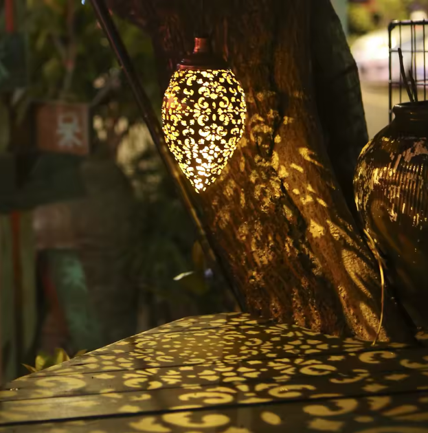 Breng warmte en stijl in je buitenruimte met deze olijfvormige solar hanglantaarn. Dankzij het unieke bloemgesneden ontwerp verspreidt de lamp een prachtig lichtpatroon in de avond, terwijl het duurzame metalen materiaal zorgt voor een lange levensduur. Aangedreven door zonne-energie is deze lamp volledig draadloos, energiezuinig en ideaal voor tuin, terras, balkon of feestelijke gelegenheden.