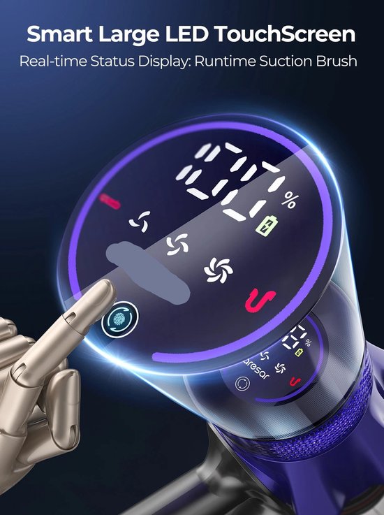 Til jouw schoonmaakroutine naar een hoger niveau met deze krachtige en slimme draadloze stofzuiger. Dankzij een indrukwekkende zuigkracht van 50.000PA en een efficiënt 500W-motorontwerp is dit apparaat ideaal voor intensieve reiniging in huis of auto. De verwijderbare accu en het handige stofreservoir maken schoonmaken eenvoudiger dan ooit.